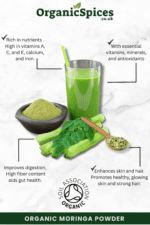 Suggestions use :- Mix ½ to 1 teaspoon of Organic Moringa Powder into smoothies, juices, or warm water for a daily nutritional boost. Stir into soups, stews, or sauces, or blend with herbal teas. Its mild earthy taste makes it an easy addition to a balanced diet.