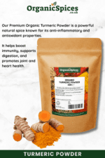 Our Organic Turmeric Powder is derived from the finest Curcuma Longa roots, grown using organic farming methods and certified by the Soil Association. Known for its warm, earthy aroma and vivid golden colour, turmeric is a staple in traditional cooking and holistic wellness practices. This turmeric powder is 100% pure and natural, containing no additives, preservatives, or artificial colouring. Carefully dried and finely ground to preserve its natural potency, this product contains a high level of curcumin, the active compound that gives turmeric its renowned properties. It’s ideal for enhancing flavour in everyday cooking while supporting a balanced lifestyle.